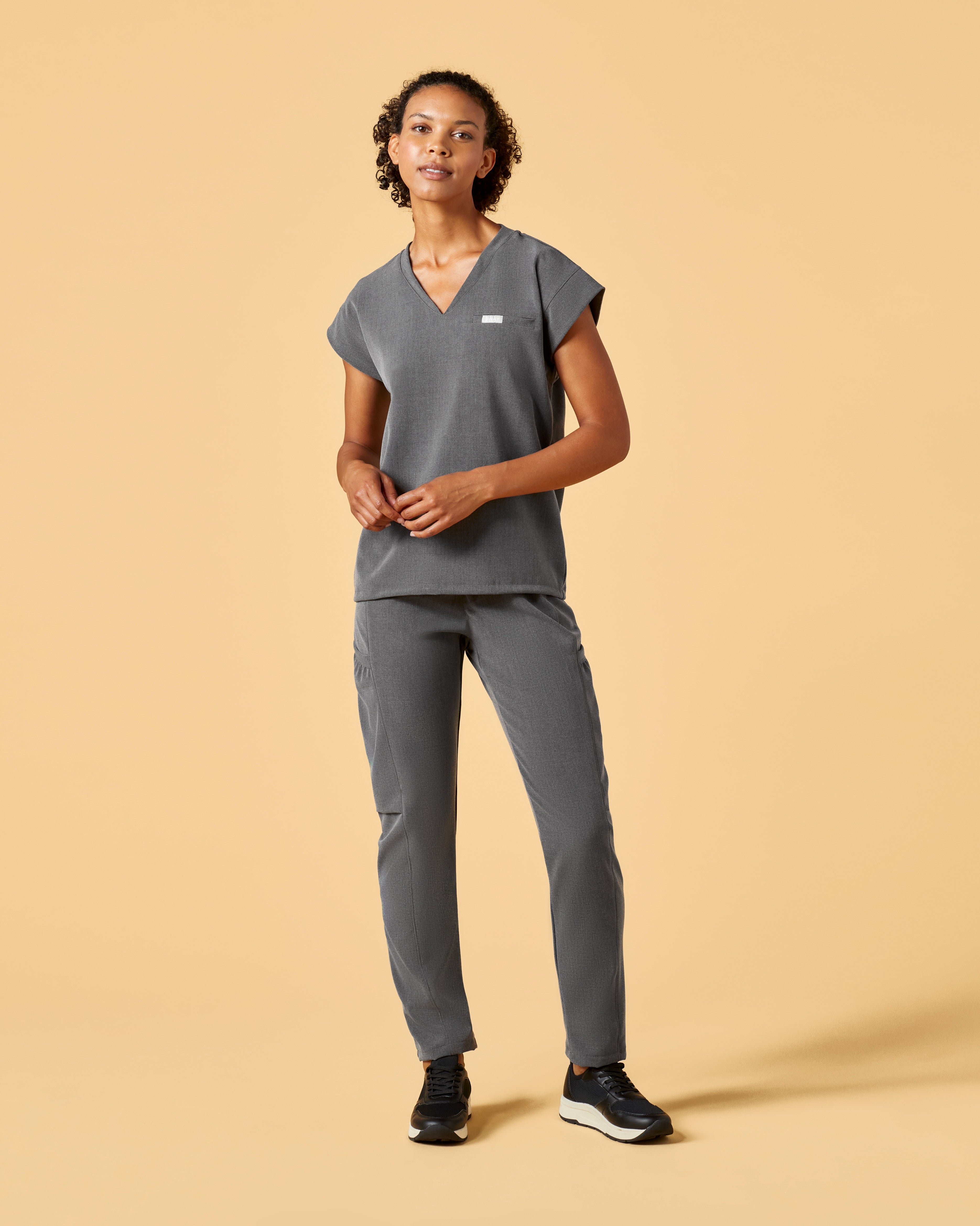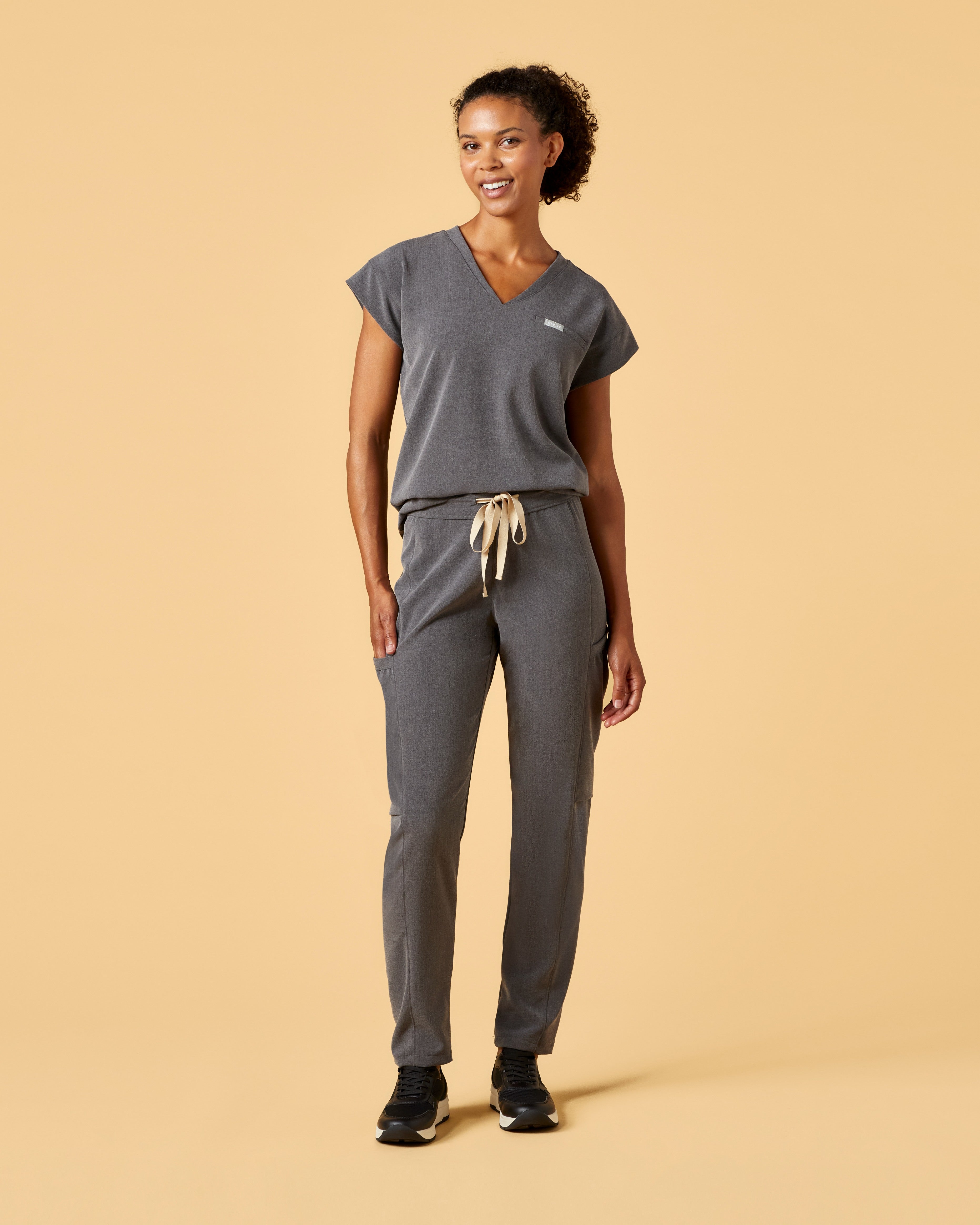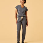 The convenience of pull-on pants with the style of a trouser. These smart-casual scrub bottoms feature pin-tuck detail along the front, four pockets, and a discrete waistband with hidden drawstring for extra comfort.