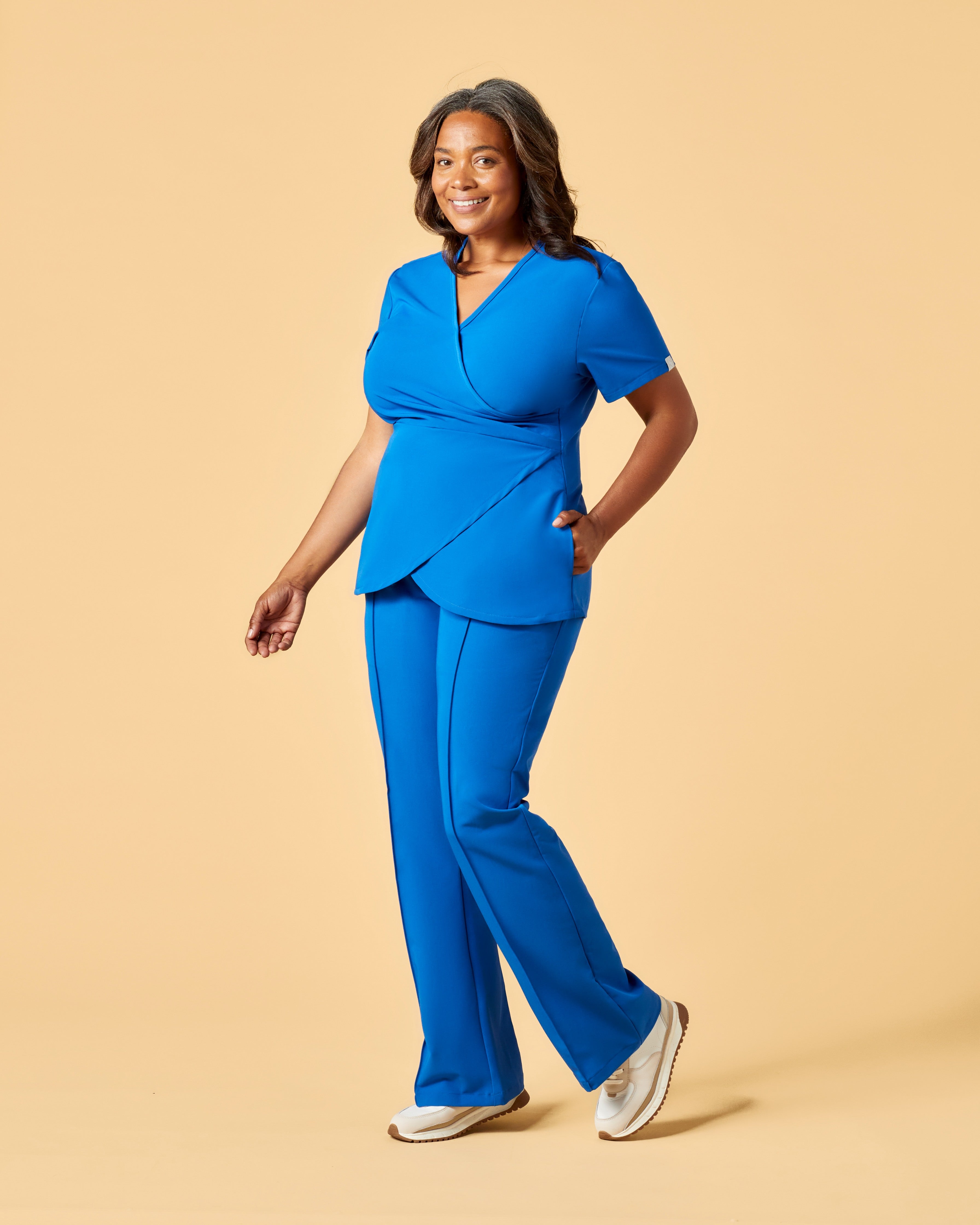 The convenience of pull-on pants with the style of a trouser. These smart-casual scrub bottoms feature pin-tuck detail along the front, four pockets, and a discrete waistband with hidden drawstring for extra comfort.